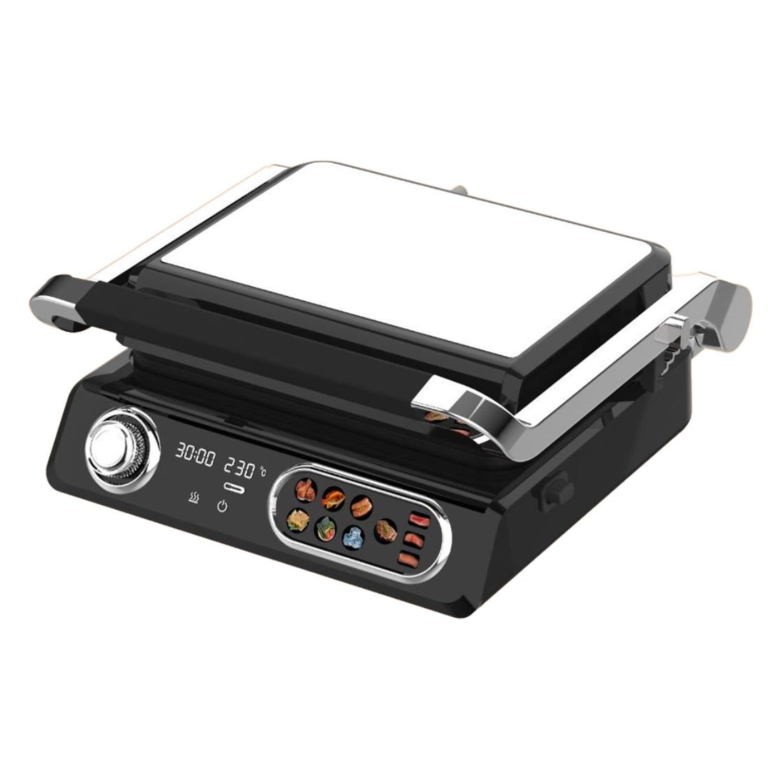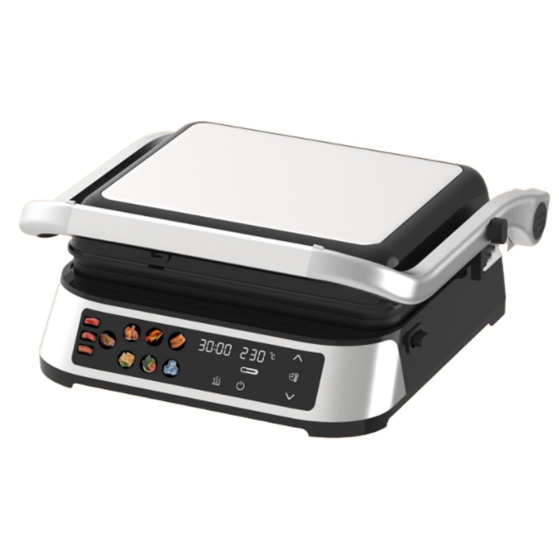 Upgrade your countertop with this Digital Contact Grill. Featuring 180° opening capability, cast aluminum plates for even heat, and a sleek stainless steel finish. Perfect for indoor BBQ, paninis, and healthy oil-free grilling. Includes a 3-year warranty.